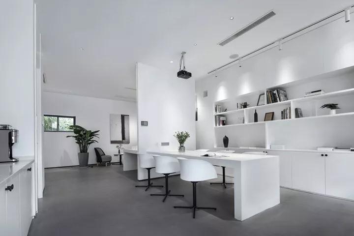 在色彩上,回歸對“無”的一種思考。設(shè)計需要一種克制的色彩,而且充滿張力和想象力。在豐富多彩的世界里,白色最接近內(nèi)心,最為尊貴,也許是最絢麗多彩的顏色。設(shè)計師選擇了白色,白色的天花,白色的墻面,白色的家具,少許低飽和度的綠色統(tǒng)一在灰色水泥地面中,形成對比,促進(jìn)著情緒和情感的激發(fā)。