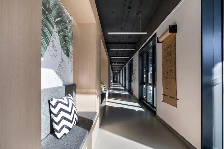 至于盒子以外的空間,設(shè)計師想凝聚更多的人文藝術(shù)氣息,選擇較多地去鋪陳展示各種抽象的藝術(shù)線條和畫作,同時為了不失去生活氣息,各個角落選擇顏色比較跳躍的家居什物,讓它作為一個流動的戶外廣場,讓人可以自在穿行其中,偶爾停駐觀察,經(jīng)得住人聲鼎沸的喧擾,亦能提供心靈靜憩的安寧。在這里,大家認(rèn)真辦公、生活、盡情交流、分享,它就是一個安放綠意,有極高包容度的公共空間。