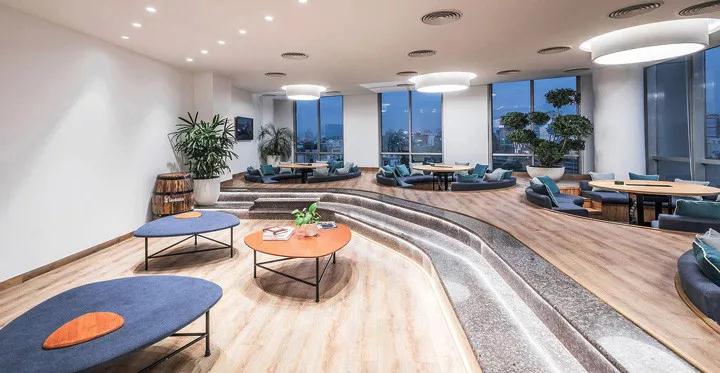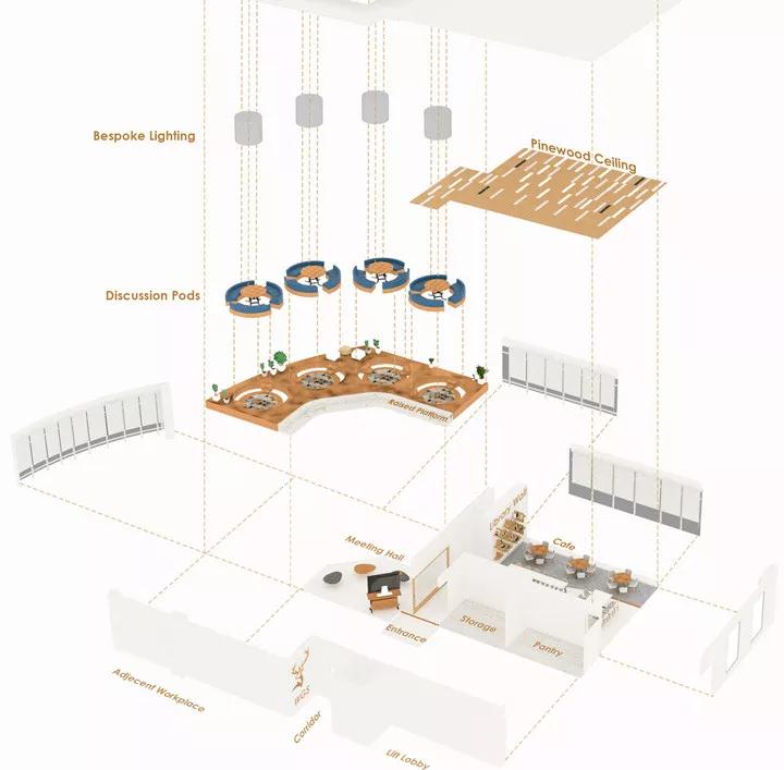 辦公室裝修設計空間被劃分成兩大功能區:會議廳和咖啡活動區。會議廳將支持市場營銷和業務開發團隊的正式討論和演講;而咖啡活動區則用于半正式和休閑的會議討論,升高的地臺,嵌入的圓形下沉式座位區,配以大型圓木桌和明亮舒適的圓形光照,這里就是會議廳。與眾不同的建筑形式讓這里有著輕松閑適的愜意氛圍,以創新形式鼓勵和促進頭腦風暴和團隊協作。