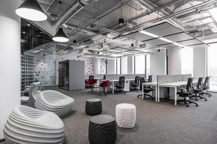 看上去這是一個很酷的科技感空間,但事實上,它的整體配色卻極為精細、并具功能性、多元性。在單色工業風質感的開放區域,多種色彩點亮了空間,深圳裝飾公司卻仍保持著統一的美學基調。墻面上的紅色幾何造型、幾件彩色家具、裝飾木柱、軟體家具,這些精致的配置足以讓室內充滿活力和朝氣。