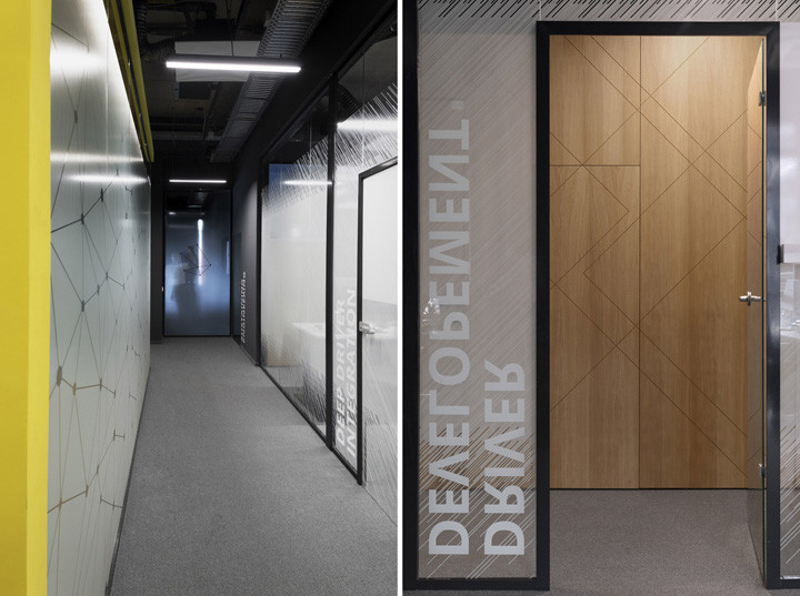 在任何情況下用戶的視覺和聽覺舒適性都是優先考慮的。公司的業務詳情需要高度的私密性,這些都通過各種各樣的飾面得以實現。裝修公司設計團隊為公司創建了一套完整的視覺體系,包括玻璃上的平面圖形、壁紙和墻面圖形等。以企業色制作的墻面和地面圖形,以及根據不同功能和光線而應用的不同透明度的玻璃隔墻和木與黑色金屬制作的隔斷等。