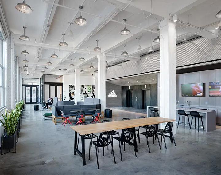 阿迪達斯(Adidas)是德國運動用品制造商。本案的辦公室,由深圳裝修公司設計團隊打造。本案將一座的兩層樓老廠房爆改成一個集辦公、發布會場和展示于一體的時尚空間。建筑將這個知名品牌的所有部門第一次聚集在同一個屋檐下,省去了租用和配備臨時活動場地的必要性,從而節省了大量資源。除室內建筑外,該項目還包括所有家具選擇,以及一個大型顧問團隊(包括視聽、安全、信息技術和品牌策劃)的合作協調。