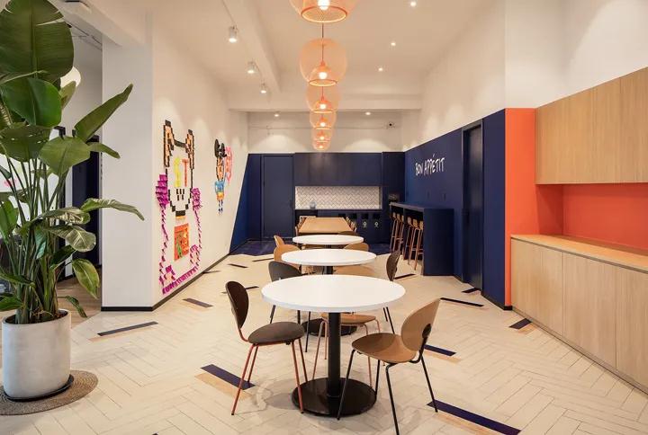 該空間用于服務(wù)整個(gè)辦公樓的商業(yè)餐廳。全部拆除后,露出了幾個(gè)混凝土結(jié)構(gòu)柱。設(shè)計(jì)團(tuán)隊(duì)將其組合到會議室的墻壁中,粗糙的原始結(jié)構(gòu)與精致的白色新墻壁形成鮮明的對比,為空間提供了更豐富的文化質(zhì)感和歷史感。但是,最令人驚訝和獨(dú)特的建筑結(jié)構(gòu)是中央的雙層高架大空間,頂部的窗戶不僅帶來了空間所需的自然光,而且還帶來了令人震驚的太空視野。