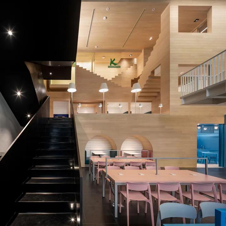 經(jīng)過初步研究,設(shè)計(jì)團(tuán)隊(duì)決定在購物中心內(nèi)創(chuàng)建五個(gè)獨(dú)立的“建筑物”,但它們可以通過視線在彼此之間建立聯(lián)系。該場地中心計(jì)劃建造一個(gè)“安靜的建筑”,周圍是透明玻璃。由于ta是一個(gè)自由的地方,因此任何人都可以在任何時(shí)間(白天或晚上)自由進(jìn)入,這種設(shè)計(jì)旨在營造一種非正式的氛圍來熱烈歡迎所有人,設(shè)計(jì)師將在入口處設(shè)置醒目的藍(lán)色咖啡吧,并將同色的休閑咖啡椅隨機(jī)擺放在周圍,以營造休閑氛圍。咖啡空間巧妙地與露臺(tái)座椅相連,形成了一個(gè)大型多功能時(shí)尚休閑區(qū)。