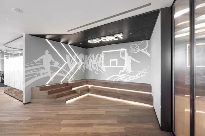 設計師還為員工增加了其他有趣的空間元素:每個員工擁有的智能儲物柜可以通過手機打開;數(shù)字板/墻可以顯示天氣預報;通過空氣質量(PM2.5測量)全面監(jiān)控辦公室空間;茶室,健身角和配套淋浴間,為女性員工提供咖啡,茶,小吃,自助午餐,飲用水設備和護理室,共同創(chuàng)造了面向未來的靈活工作空間,為員工提供舒適的福利。基于可持續(xù)發(fā)展的理念,萬科濱海云辦公空間獲得了“ LEED金牌”和“國家綠色三星”綠色建筑兩項認證,這在深圳是罕見的。辦公裝修空間中的“迷你圖書館”具有無限的學習,無限的思考,閱讀和創(chuàng)造力。中央樓梯的開放式設計將空間上下連接。除了工作,您還可以適度地鍛煉身心。有相當數(shù)量的會議空間,它們的單位大小各不相同,從而創(chuàng)造了更加靈活和協(xié)作的通信效率。陽光透過落地窗射出陽光,每天為辦公室區(qū)域增添活力,與此同時,我們的設計師受到萬科文化的啟發(fā),并為每層地板設計獨特的圖案和顏色,因此具有代表性,營造出充滿體育活力,人文關懷和開放式創(chuàng)新的萬科精神,使公司訪客真正體驗傳統(tǒng)企業(yè)的動態(tài)轉型。