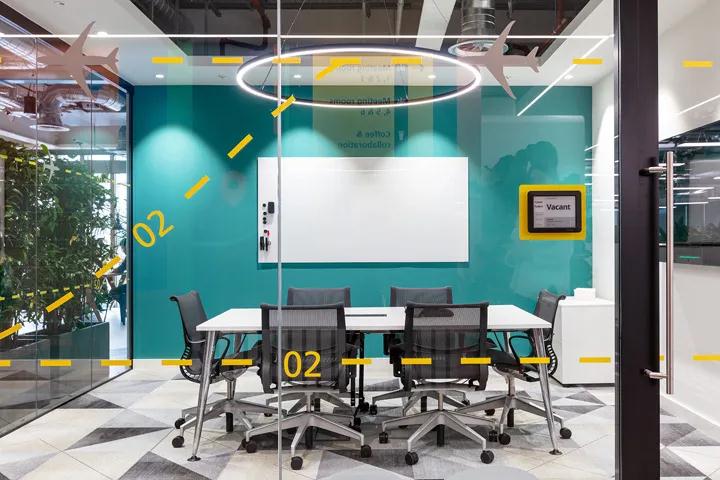 為了創造一個可以反映公司前瞻性思維的文化空間,此表殼將其與旅游主題元素相結合,創造了一個充滿獨特氣質的時尚創新空間。孟菲斯經典的娛樂元素和智能瓷磚,幾何壁紙,醒目的印花織物以及豪華的水磨石地板使房間變得時尚。尤其是在休閑區,高檔家具襯托了孟菲斯風格的裝飾主題,宜人的多彩配色帶來了美妙的時尚視野。更加注意溝通和團隊合作的文化。因此,設計團隊構建了一個由多個會議室,共享辦公桌組成的開放式布局,并在團隊的基礎上創造了平等的工作環境,而會議室為私人交流和創新合作提供了豐富的空間。此外,設計團隊還介紹了一種特殊的會議區域模型,以鼓勵工作中的協作。