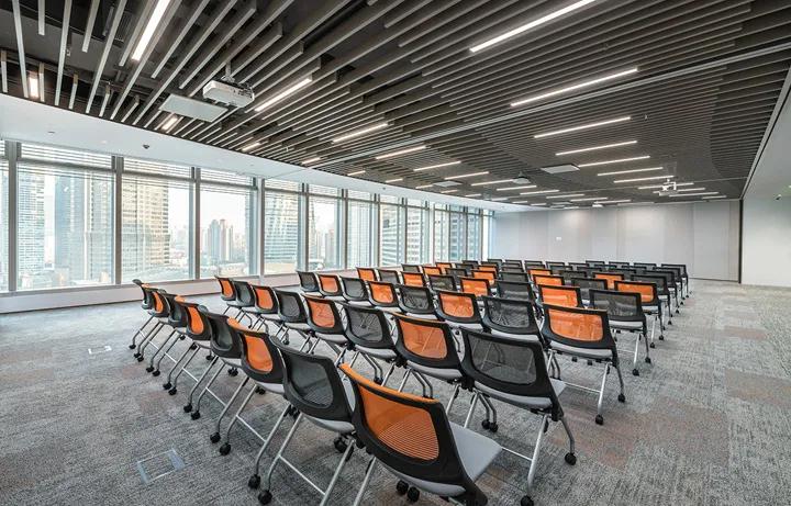此外,為新辦公樓規(guī)劃和設(shè)計(jì)了一個(gè)多功能空間,可用于聚會(huì)和聯(lián)賽建設(shè),公益基金會(huì)展覽,集思廣益,舞蹈室,團(tuán)體運(yùn)動(dòng)室,瑜伽室等,從而員工可以輕松享受高質(zhì)量的體驗(yàn),緩解疲勞,保持工作健康并改善情感聯(lián)系和幸福指數(shù)。鑒于公司不斷增長(zhǎng)的業(yè)務(wù)需求和社交活動(dòng),該空間創(chuàng)造性地引入了一個(gè)酒吧區(qū),該酒吧區(qū)擁有舉辦公司外事和內(nèi)部活動(dòng)的絕佳景觀。標(biāo)志墻上方的藝術(shù)裝置燈具就像“龍游”,因此光滑的天花燈帶將延續(xù)這里前部的靈巧氛圍;酒吧的上方圓圈設(shè)計(jì)為鮮橙色,形成了一個(gè)充滿活力的社交中心,增進(jìn)了中國(guó)與客戶之間的聯(lián)系,并提供了美妙的客戶體驗(yàn)。空間的平面布局充分利用了無(wú)與倫比的城市景觀,使員工和游客可以享受心情并緩解動(dòng)態(tài)景觀帶來(lái)的壓力。轉(zhuǎn)角會(huì)議室的兩側(cè)都有窗戶,可將深圳地標(biāo)性建筑景觀盡收眼底。會(huì)議室配有智能會(huì)議系統(tǒng),可以方便,高效地支持不同的會(huì)議場(chǎng)景和要求。會(huì)議室的膠卷比傳統(tǒng)膠卷低15厘米,以確保會(huì)議室的私密性,并為游客提供直接面對(duì)陸家嘴的景觀走廊。培訓(xùn)中心擁有充足的自然采光,可輕松布置各種布局,并配有可移動(dòng)的隔板,以提高空間利用率,并為所有員工會(huì)議,教學(xué)和培訓(xùn),主題演講,模擬法庭等創(chuàng)建靈活靈活的多個(gè)場(chǎng)景。為了在培訓(xùn)過程中滿足用戶的臨時(shí)通話需求,在附近規(guī)劃了兩個(gè)具有隔音效果的電話亭,從使用細(xì)節(jié)上改善空間的功能性,營(yíng)造以人為本的全方位環(huán)境。