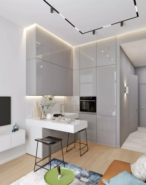 我們?cè)谛?hù)型裝修設(shè)計(jì)中因空間受限,時(shí)常難以妥善規(guī)劃,深圳裝飾公司雄宇裝飾便將公私領(lǐng)域一分為二,從玄關(guān)進(jìn)入即可看見(jiàn)一道墻隔開(kāi)客餐廳與臥室。公空間雖然狹小,但運(yùn)用斑駁藍(lán)白地毯便能簡(jiǎn)單作出區(qū)隔,此時(shí)搭配對(duì)比色深橘沙發(fā),就可輕易塑造視覺(jué)主焦點(diǎn),穩(wěn)定室內(nèi)不顯紊亂;廚房柜體則透過(guò)延續(xù)玄關(guān)淺灰色調(diào),借此連貫空間營(yíng)造寬敞感,料理區(qū)則保留簡(jiǎn)易烹調(diào)器具,深圳家庭裝修并且以L型臺(tái)面連結(jié)吧臺(tái)桌面拓展出精簡(jiǎn)用餐區(qū)。