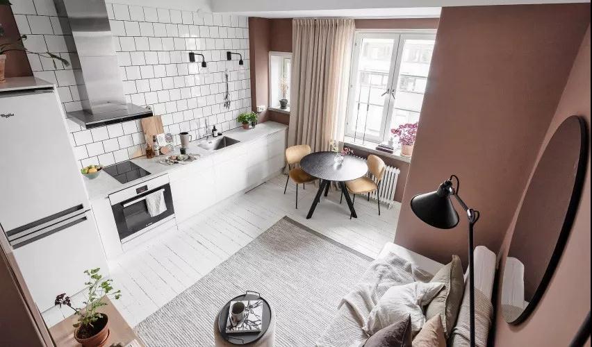 整體墻面漆繪煙熏粉營造輕柔粉嫩氣息,鄰窗處配置低矮餐桌椅使光線自然灑落,相映沙發背墻的大面圓鏡,裝修設計使空間感無盡延展放大,同步考量清潔實用性,烹調區以純白壁磚與櫥柜筑起清爽視感,在可可棕、奶茶粉調的低彩軟件交織之下,體現優雅小空間的舒心情景。